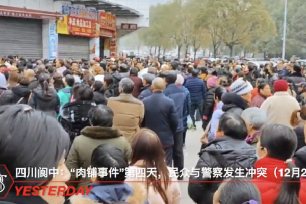 「四川阆中:“肉铺事件”第四天,民众与警察发生冲突(12月26日)」周五,四川阆中“肉铺打人”事件进入第四天,民众的怒火并未平息。上千民众再次聚集在涉事肉铺门口,继续抗议肉铺老板的恶霸行径,要求严惩凶手,还受害者一个公道。当地政府如临大敌,出动大量警力在现场进行警戒,试图控制局面。… pic.twitter.com/cIYezWckkm