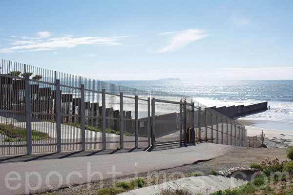 聖地亞哥聖西卓(San Ysidro)美墨邊境牆入海的部份。牆左邊是墨西哥,右邊是聖地亞哥。(楊婕/大紀元)