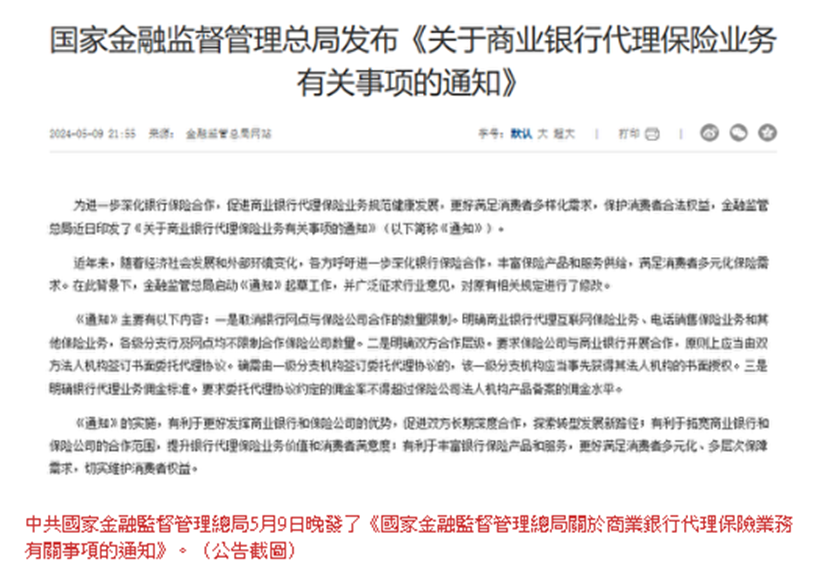 中共国家金融监督管理总局5月9日晚发布《国家金融监督管理总局关于商业银行代理保险业务有关事项的通知》。