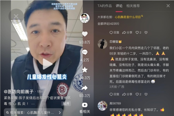 抖音科普博主談孩子流感病毒引發心肌炎的博文引起巨大反響。評論區留言中,民間披露這邊疫情中很多人去世。(視頻截圖)