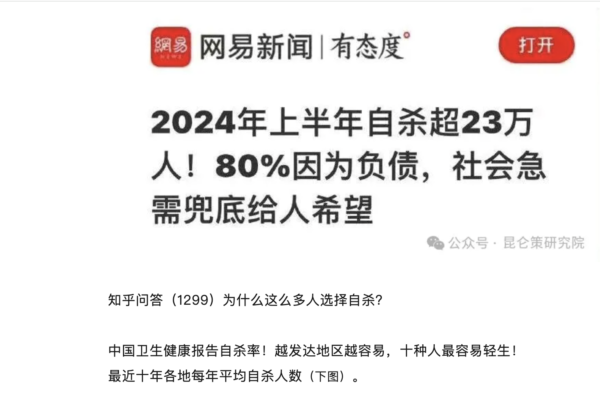 中國經濟下行,社會特別壓抑,自殺率暴漲。據陸媒報導,2024年上半年中國自殺的人超23萬,其中80%因為負債。(網頁截圖)