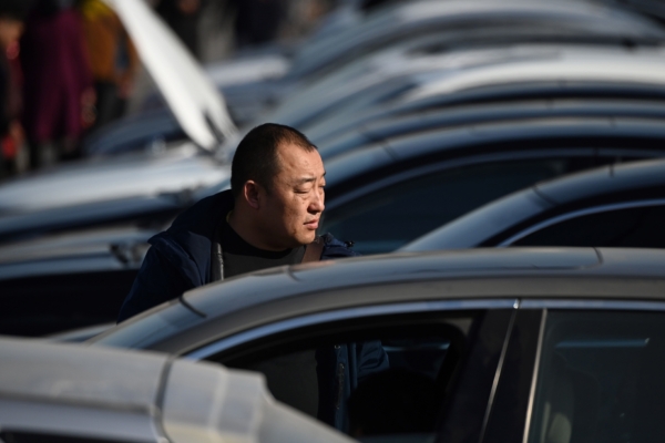 在多地執行OBD車檢新規後,中國車友稱「二手車交易的天塌了」。圖為2019年1月22日,一名男子走過北京的一個二手車銷售場。(GREG BAKER/AFP via Getty Images)