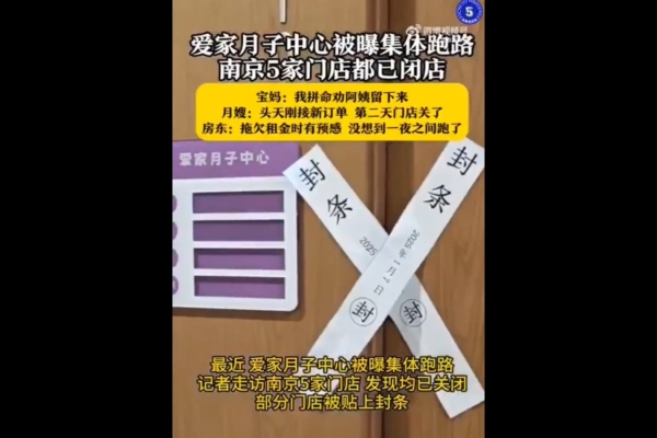 2025年1月7日,大陸知名母嬰連鎖品牌愛家月子中心一夜間爆雷,門店停業,人去樓空,大批產婦與月嫂陷入困境,維權遭打壓。(視頻截圖)