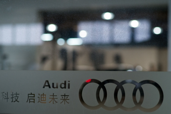 An Audi logo is pictured at a car seller in Shanghai on August 6, 2014. German luxury car maker Audi and Chrysler of the United States have committed "monopoly behaviour" in China and will be punished soon, the country's regulator said, as a probe of foreign auto firms grows. AFP PHOTO / JOHANNES EISELE (Photo by JOHANNES EISELE / AFP) (Photo by JOHANNES EISELE/AFP via Getty Images)
