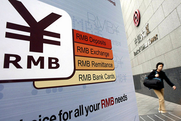 HONG KONG, CHINA: A woman walks past a Chinese "renminbi" (RMB or yuan) currency sign advertising personal services at its headquarters in Hong Kong, 24 February 2004. The Bank of China (BOC) are launching the personal services aimed at the local banking sector for them to operate personal "renminbi" businesses and better meet the needs of the economic and commercial integration between Hong Kong and mainland China. Around 40 banks in the city will be able to offer deposit, exchange and remittance services in the Chinese currency. AFP PHOTO/TED ALJIBE (Photo credit should read TED ALJIBE/AFP/Getty Images)
