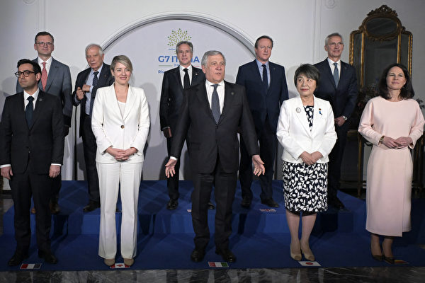 2024年4月18日,烏克蘭外交部長德米特羅‧庫列巴(Dmytro Kuleba)、歐盟外交政策負責人何塞普‧博雷利(Josep Borrell)、美國國務卿安東尼‧布林肯(Antony Blinken)、英國外交大臣戴維‧卡梅倫(David Cameron)、北約祕書長延斯‧斯托爾滕貝格(Jens Stoltenberg)、法國外長斯特凡納‧塞茹爾内(Stephane Sejourne)、加拿大外長趙美蘭(Melanie Joly)、意大利外長安東尼奧‧塔亞尼(Antonio Tajani)、日本外相上川陽子(Yoko Kamikawa)和德國外長安娜萊娜‧貝爾博克(Annalena Baerbock)在卡普里(Capri)小島舉行的G7外長會議期間合影留念。(Tiziana Fabi/AFP via Getty Images)