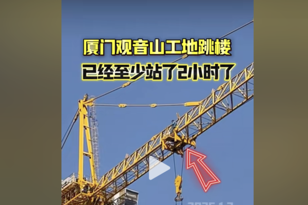多個大陸博主發布消息稱,2025年1月3日,廈門觀音山,一個農民工站在塔吊上討薪。據披露,其實一早,在現場就有工人拉了橫幅「還我血汗錢」,沒想到有一個工人直接爬上吊車去了,期間吊車底下並沒有鋪安全氣墊,該工人至少站了兩個多小時。最後消防車和警察都趕到了現場,相互溝通談妥了後,工人自己下來了。