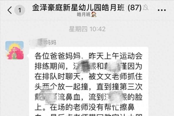 華商報大風新聞報導,群名為「金澤豪庭新星幼兒園皓月班」的群聊顯示,家長在群內發言稱,兩名孩子因在運動會排練期間相互說話,某老師抓住兩孩子的頭互撞,其中一名孩子流鼻血。一名家長表示,放學後找涉事老師了解情況,她謊稱天氣乾燥沒喝水所以流鼻血,否認傷害孩子的事,轉天調取監控才看到真實情況。