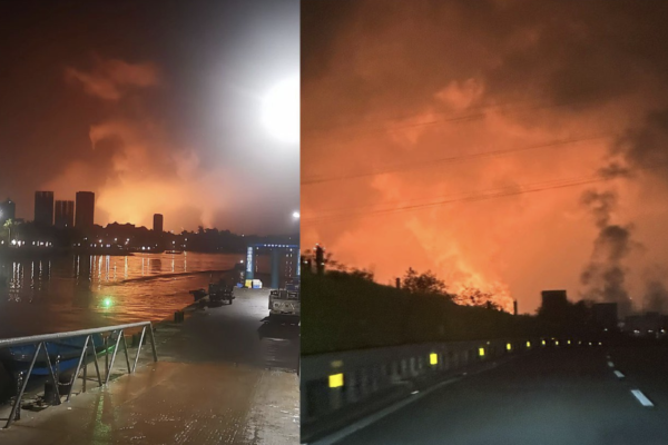 大陸和香港網絡於12日晚流傳多張大亞灣的相片,顯示有廠房冒出大量不明煙霧,夜空被染成橙紅一片