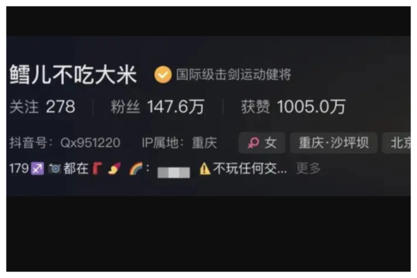 秦雪的短視頻帳號「鱈兒不吃大米」,目前的粉絲數量超147萬,幾條置頂視頻分別是與3歲女兒的合照、網名的由來以及擊劍比賽的場景。秦雪稱,之所以網名叫「鱈兒不吃大米」,是因為她吃大米都過敏。