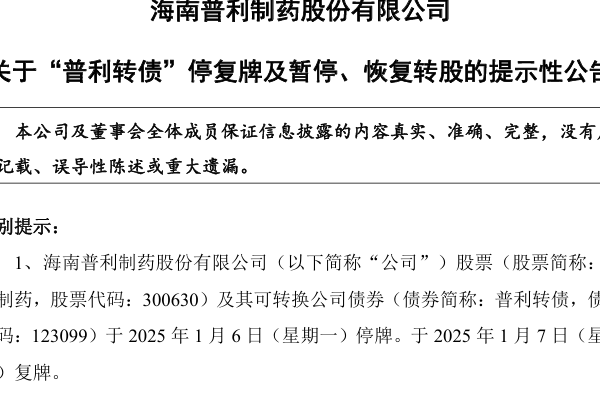 普利製藥1月5日發布公司《關於「普利轉債」停復牌及暫停、恢復轉股的提示性公告》公告,公司股票1月6日開始停牌,1月7日起復牌,自復牌之日起,公司股票被實施退市風險警示,股票簡稱變更為「*ST普利」。