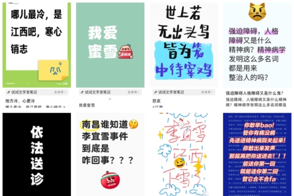 江西南昌當局發布第二份通告承認李宜雪再度被送精神病院治療,激怒網絡輿論,駁斥通告內容。之後,社交媒體平台下架李宜雪的所有內容,及禁止關注李宜雪帳號。(網絡截圖/大紀元合成)