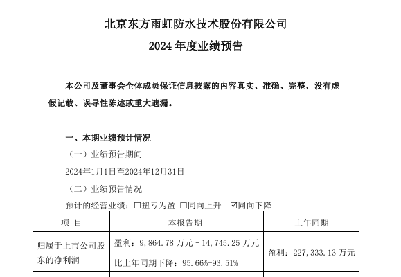 【2025年01月27日訊】(記者劉毅報導)被譽為「防水茅」的北京東方雨虹防水技術股份有限公司(東方雨虹)日前發布公告稱,預計2024年虧損,淨利潤同比下降95.66%至93.51%。