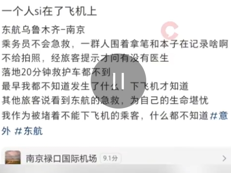 據一網民在社媒上發文表示,其是該航班的乘客,乘客突發疾病後,當時乘務員不會急救,一群人圍著拿筆和本子在記錄,經乘客提醒之後才開始廣播尋找乘客裡面有沒有醫生。飛機抵達南京機場後,「落地20分鐘,救護車都不到」。