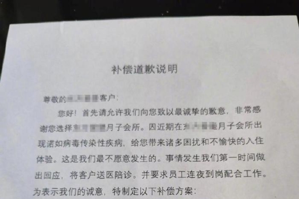 河南信陽平橋區某月子中心出現諾如病毒。圖為該月子會所的《補償道歉說明》。(網絡圖片)