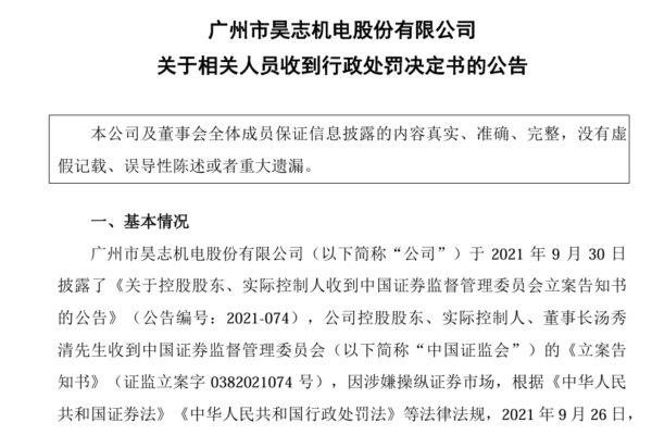 昊志機電在31日的《關於相關人員收到行政處罰決定書的公告》中表示,公司收到公司控股股東、實際控制人、董事長湯秀清和公司董事、董事會祕書、副總經理、財務總監肖泳林的通知,他們收到中共證監會的《行政處罰決定書》。《行政處罰決定書》顯示,兩人因涉嫌操縱證券市場,對湯秀清處以1.09億元罰款,對肖泳林處以200萬元罰款。