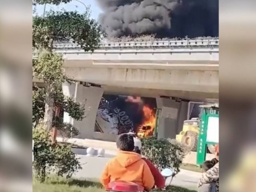 視頻顯示,現場滾滾黑煙直衝雲霄,橋上多車停靠在一邊,護欄多處被撞毀,車輛撞擊後的大量碎片散落一地。另一視頻顯示,一水泥罐車墜落在橋底起火。