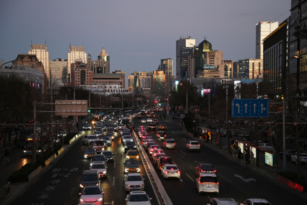 產能過剩、物價跌不停之際,中國經濟陷惡性循環。資料圖:2024年12月6日傍晚,北京街道上行駛的汽車。(Greg Baker/AFP via Getty Images)