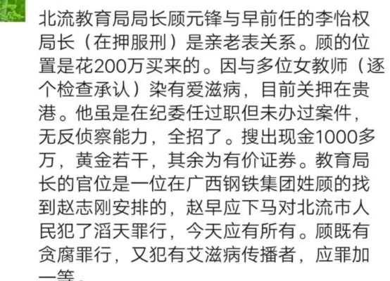 11月14日,有網民爆料稱,廣西北流市教育局長顧某某被抓後查出艾滋,全市多所學校女教師體檢排查。消息在網上熱傳,引發關注。(網頁截圖)