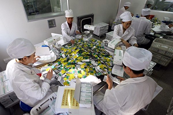 圖為工人們在中國一家製藥公司包裝藥片。(Frederic J. Brown/AFP)