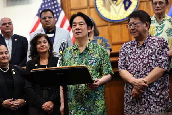 據中央社報導,賴總統5日上午受邀前往關島議會參訪,包括美國在台協會(AIT)執行理事藍鶯、關島議會議長泰拉耶(Therese M. Terlaje)、副議長巴恩斯(Tina Rose Muña Barnes)及多位參議員都出席迎接賴總統。泰拉耶致詞後,並將友台決議文呈贈賴總統,同時也致贈當地用木頭雕刻的紀念品,上面貼有中華民國國旗與關島旗幟。