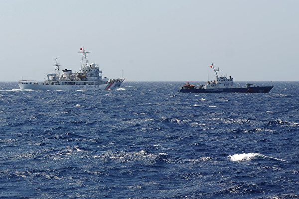 2024年10月31日,越南外交部要求中共立即釋放在南海爭議水域非法扣押的越南漁民和船隻。圖為2014年5月14日,中共海岸巡防隊的船隻(圖左)與越南海岸巡防隊的船隻(圖右)在南海相遇。(Hoang Dinh Nam/AFP/Getty Images)