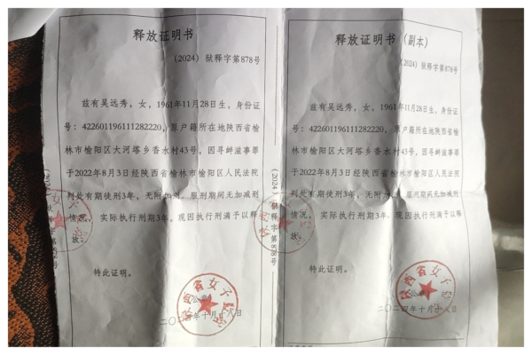 【2024年11月12日訊】(記者李熙採訪報導)陝西訪民吳遠秀因合同糾紛案長期在北京維權。三年前北京公安人員謊稱她一個案件有文字回覆,要她親自去領取。當她離開公安局50米處轉進巷子後遭到地方六名政府人員綁架,隨後她被投入監獄關押三年,於今年10月18日出獄。