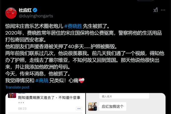 旅居泰國的藝術家杜應紅1月8日在海外X平台發消息(鏈結)說,前幾天他和費曉勝剛剛通了一個視頻,得知他辦了護照,但在他準備出來的時候,8日卻接到消息說他又被抓了。