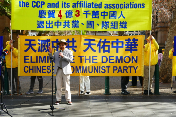 2024年6月29日,悉尼各界在市中心舉行退黨集會,慶祝4.3億勇士退出中共組織。悉尼科技大學中國問題學者馮崇義在集會上發言。(安平雅/大紀元)
