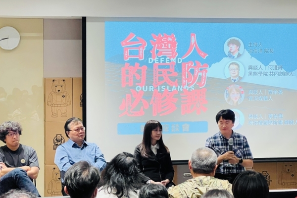 台灣黑熊學院整合各類專業與各國最新民防經驗,出版雙冊《台灣人的民防必修課》,25日新書發表座談會邀請到黑熊學院共同創辦人兼榮譽院長沈伯洋、黑熊學院共同創辦人兼首席顧問何澄輝、蔡依橙醫師、資深媒體人簡余晏共同與談書中章節,呼籲各界重視中共的灰色地帶作戰、建立面對認知戰的心防,以及一般人都能學習的基礎救護技術。