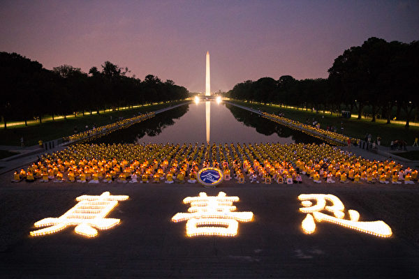 2017年7月20日晚,美東部分法輪功學員在首府華盛頓林肯紀念堂前舉行燭光夜悼,悼念被中共迫害致死的法輪功學員。(戴兵/大紀元)