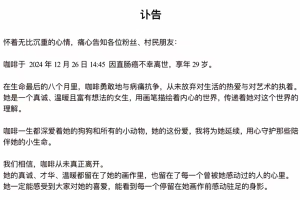 12月28日,網紅繪畫博主「咖啡」的助理發訃告稱:網紅「咖啡」已於2024年12月26日14:45分因直腸癌不幸去世,年29歲。