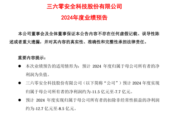360在1月17日發布的《三六零安全科技股份有限公司2024年度業績預告》顯示,預計2024年全年淨利潤-7.7億元至-11.5億元,同比下滑56.5%至133.74%;預計2024年度實現歸屬於母公司所有者的扣除非經常性損益的淨利潤約 為-12.7 億元至-8.5億元。