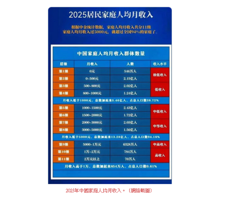 最近在网络上流传一张《2025年中国家庭人均月收入》,根据中金统计数据,家庭人均月收入共分11级别和6个收入水平组群。
