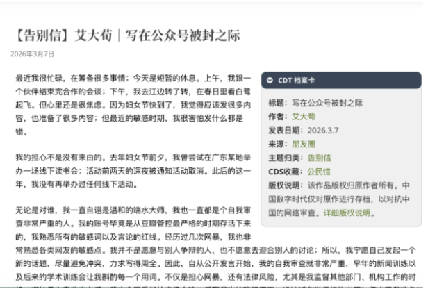 近日,中国公益领域知名公众号作者艾大荀的账号遭永久封禁。根据「中国数字时代」(CDT)存盘的一篇告别文《写在公众号被封之际》揭露,触发此次封号的竟是一篇发表于2025年7月、内容仅为讨论「武大图书馆事件」的法律科普文章。