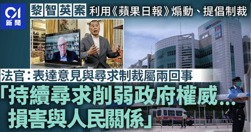 2025 年 12 月 15 日,香港高等法院宣判壹传媒创办人黎智英涉「串谋勾结外国势力危害国家安全」及「串谋发布煽动刊物」三项罪名成立。判决书总长高达 855 页的理由书显示,法院指控黎智英利用旗下传媒平台 Apple Daily 有组织地推动被定性为危害国家安全的言论与活动。