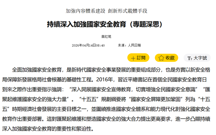 2026年4月,在「全民国家安全教育日」前夕,中国官方正式推出《国家安全教育中小学生读本》,并要求全国各级学校统一使用,从小学到高中全面覆盖。