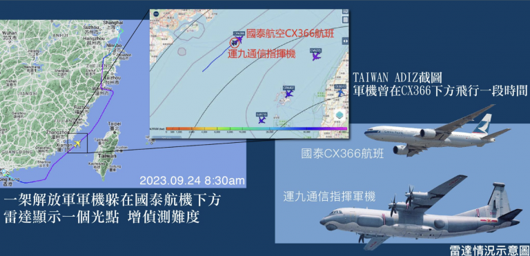 台湾军事专页「TAIWAN ADIZ」24日揭露,早上8:30,一架大陆运九通信指挥军机,躲在香港国泰民航机底下,航班为国泰CX366,波音777航机由香港飞往上海,途经台湾海峡上空,最多可搭载368名乘客。中国疑似在演练以民航机掩护解放军军机,想借此躲避雷达侦测,军机躲在民航机底下,从雷达上来看,因位置重叠只会显示一个光点,的确能造成侦测困难。