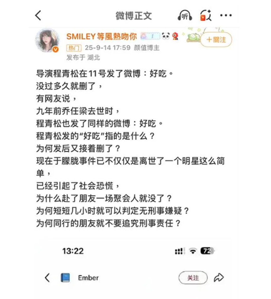 中国37岁男星于朦胧上月11日在北京坠楼身亡的消息震惊娱乐圈,然而事件发生后没几天,外网开始流传许多疑似为事发当下影片、录音档,拼凑出死亡时间线,推测于朦胧死于他杀,更传出有中共官员介入此事。针对于朦胧的死亡谜案,有中国命理专家发现,网传的于朦胧死法竟然跟古代邪术极为相似,以此怀疑其时于朦胧早被这群人盯上,为了在中共领导人习近平本命年将其献祭于他,让他能够延寿至150岁,相关细节曝光后,让网友感到背脊发凉、毛骨悚然。