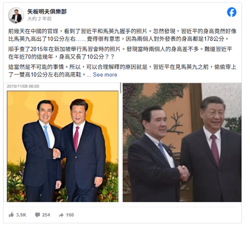 不过日本资深媒体人矢板明夫2024年就曾PO出习近平与前总统马英九的合照,指出2人当时皆对外宣称身高178公分,但照片中的习近平却明显比马英九高出一截,让矢板明夫断言,习近平是偷穿高10公分左右的高底鞋。