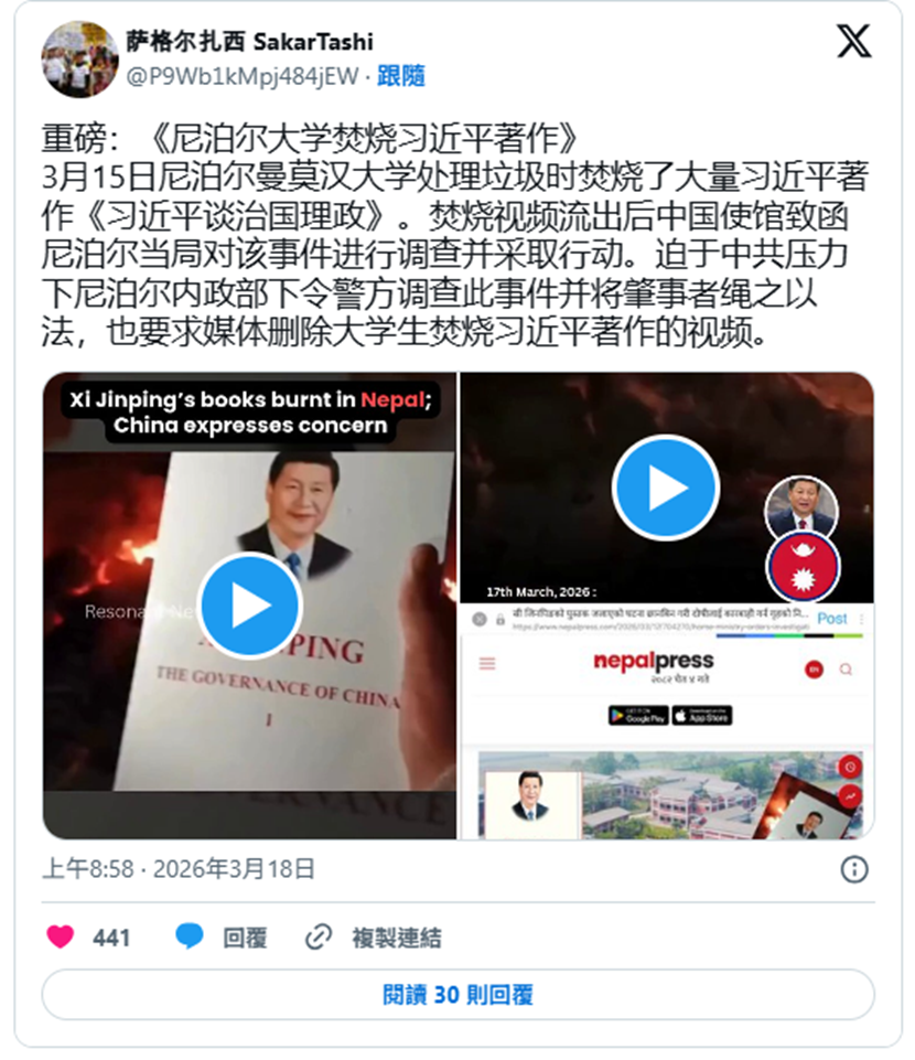 尼泊尔1所技术学院近日传出焚烧数百、甚至数千本中国国家主席习近平的著作,引发中共官方不满,向尼泊尔外交部提出抗议。迫于中共压力,尼泊尔内政部下令警方调查事件,也要求媒体删除相关内容。
