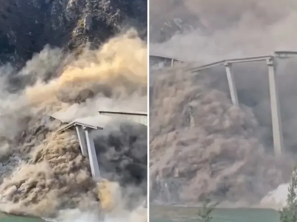 中国四川阿坝州红旗特大桥,昨(11)日传出坍塌事故,连接山体边坡的桥墩与桥头路面发生断裂,桥体残骸与大量土石倾泻而下,激起现场烟尘满天,景象十分惊人。该大桥今年1月中旬才合龙竣工建成,启用不到10个月便发生断桥事故,当地政府初步表示是因为山体变形加剧,造成山泥倾泻,导致路基及引桥垮塌。